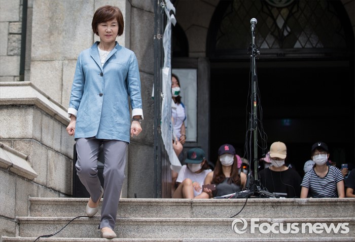 (서울=포커스뉴스) 최경희 이화여자대학교 총장이 3일 오후 서울 서대문구 이화여대 본관에서 평생교육 단과대학인 '미래라이프대학' 설립 중단 발표를 마친 뒤, 자리를 빠져 나오고 있다.