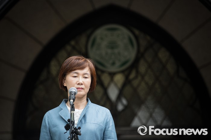 (서울=포커스뉴스) 최경희 이화여자대학교 총장이 3일 오후 서울 서대문구 이화대 본관에서 평생교육 단과대학인 '미래라이프대학' 설립 중단 발표를 하고 있다.