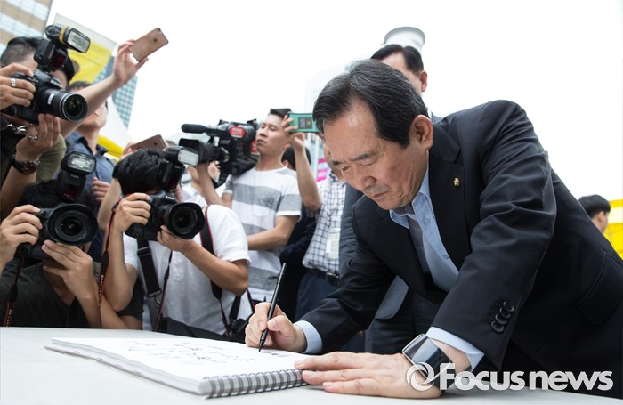 (서울=포커스뉴스) 정세균 국회의장이 2일 오전 서울 종로구 광화문광장에서 단식농성 중인 이석태 세월호 참사 특별조사위원장 면담 후 방명록을 작성하고 있다.