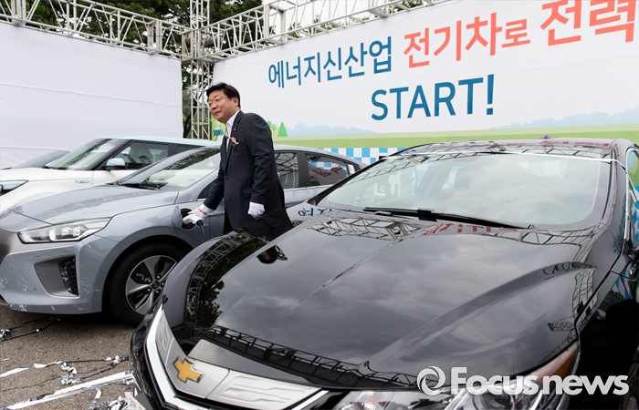 (서울=포커스뉴스) 2일 오후 서울 마포구 상암월드컵경기장에서 개방형 전기차 충전소 1호 착공식에 참석한 주형환 산업통상자원부 장관이 전기차 충전을 시연하고 있다.