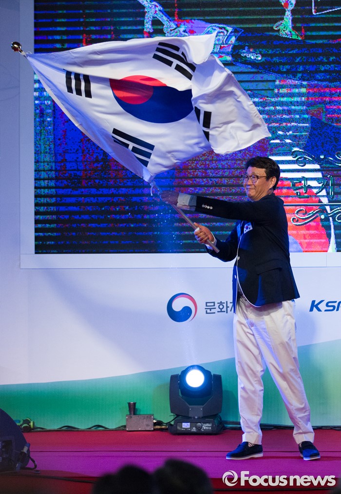 (서울=포커스뉴스) 2일 오후 서울 송파구 올림픽파크텔에서 열린 2016 리우 패럴림픽 대한민국 선수단 결단식에 참석한 정재준 선수단장이 김성일 대한장애인체육회 회장에게 전달받은 태극기를 흔들고 있다.