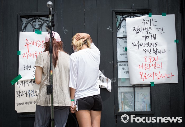 (서울=포커스뉴스) 3일 오후 서울 서대문구 이화여대 본관 정문 점거 농성장 앞에서 이화여대 학생들이 지친 모습을 보이고 있다. 이날 최경희 이화여자대학교 총장은 '미래라이프대학' 설립 중단 발표 기자회견을 가졌다.