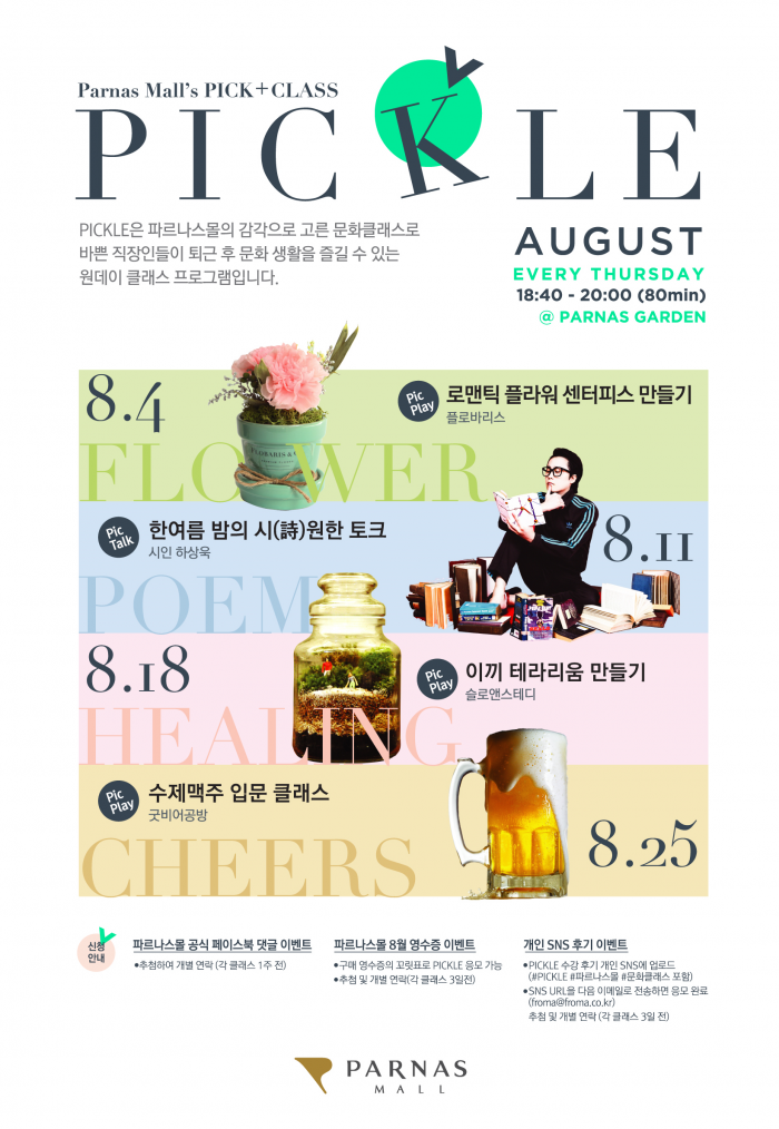 참가 신청은 파르나스몰 공식 페이스북에서 댓글 이벤트로 클래스 일정에 따라 순차적으로 진행되며 응모자 중 추첨을 통해 고객들을 초청한다. 또한 파르나스몰 구매고객들을 대상으로 영수증 이벤트도 함께 진행한다. 구매 영수증의 꼬리표로 응모하면 되며 추첨을 통해 초청한다. 피클 참여자들의 'SNS 후기 이벤트'도 계속된다. 클래스 참가 인증샷과 후기를 게시한 고객들 중 추첨을 통해 다음 클래스를 수강할 수 있는 기회를 제공한다.파르나스몰은 직장인을 위한 문화예술 행사인 '피클(pickle)'의 8월 클래스를 매주 목요일 오후 6시40분부터 약 80분간 파르나스 가든에서 진행한다고.<사진제공=인터컨티넨탈호텔>