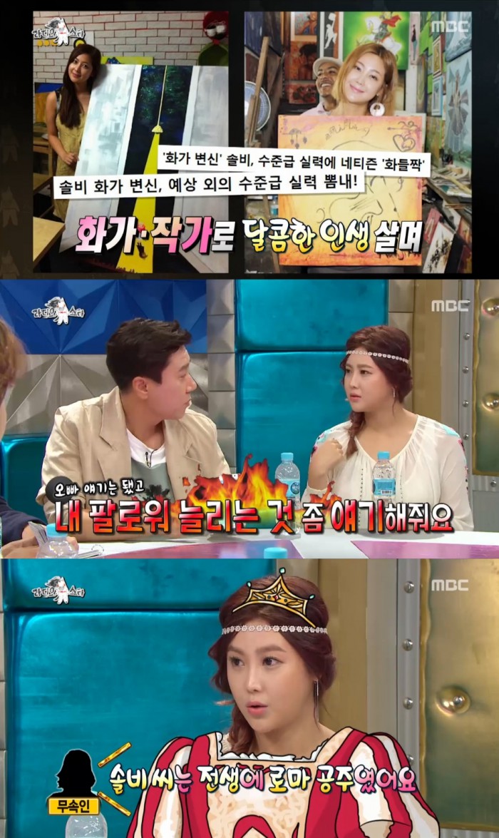 솔비는 3일 방송된 MBC 수요 심야 예능 프로그램 '라디오스타'에 4년 만에 출연했다. 오랜만의 출연이 낯설 법도 했지만 녹슬지 않은 입담을 과시하며 좌중을 웃음바다로 만들었다.