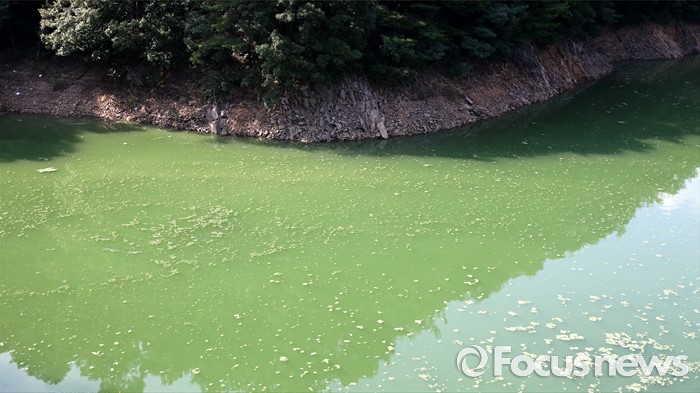 (청주=포커스뉴스) 폭염이 이어지면서 대청호 수역에 조류경보 '관심' 단계가 내려진 가운데 4일 오후 충북 청주시 상당구 문의대교 인근 대청호에 녹조가 형성돼 있다.