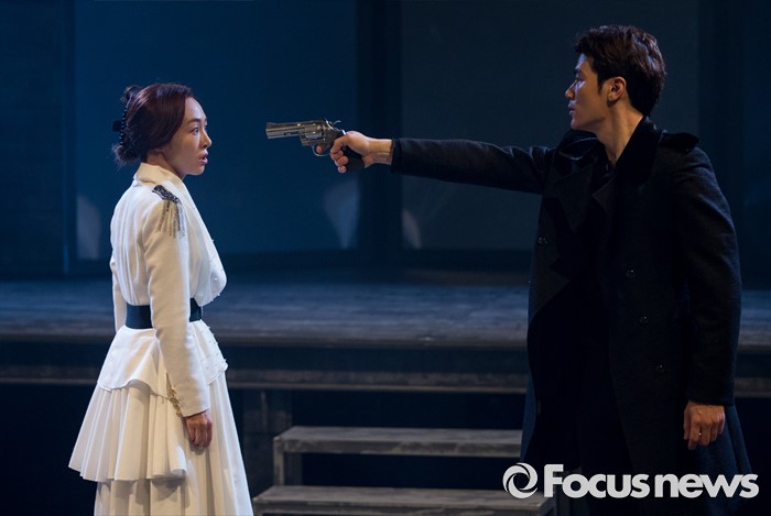 (서울=포커스뉴스) 4일 오후 서울 중구 충무아트센터에서 열린 연극 '햄릿-더 플레이' 언론시연회에 참석한 배우 김강우(오른쪽), 이진희가 열연하고 있다.