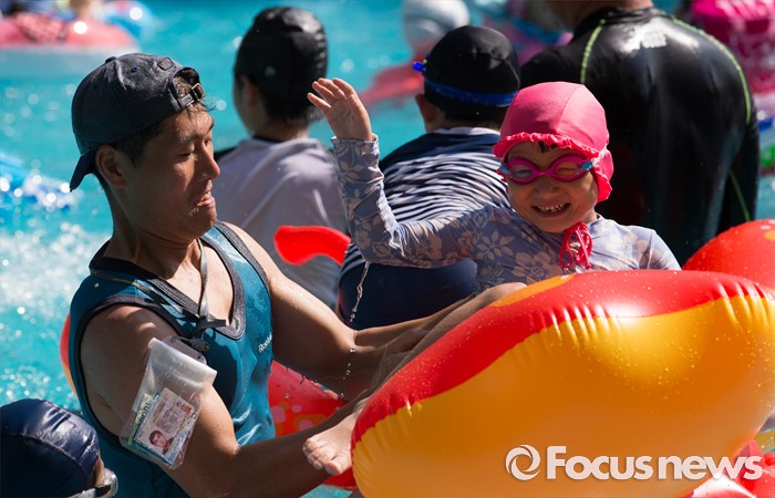 (서울=포커스뉴스) 서울에 첫 폭염경보가 내려진 4일 오후 서울 서초구 양재시민의숲 내 양재천 수영장을 찾은 시민들이 물놀이를 하고 있다.
