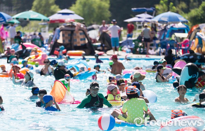 (서울=포커스뉴스) 서울에 첫 폭염경보가 내려진 4일 오후 서울 서초구 양재시민의숲 내 양재천 수영장을 찾은 시민들이 물놀이를 하고 있다.