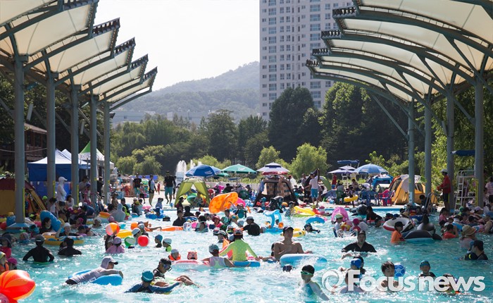(서울=포커스뉴스) 서울에 첫 폭염경보가 내려진 4일 오후 서울 서초구 양재시민의숲을 찾은 시민들이 물놀이를 하고 있다.