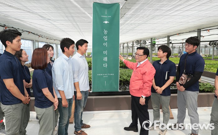 (진천=포커스뉴스) 이동필 농림축산식품부 장관이 4일 충북 진천군 '만나 CEA' 농업회사법인을 찾아 ICT와 바이오기술을 결합한 식물공장 채소류 재배시설 등 스마트 팜 확산 사례를 현장 점검하고 있다. <사진제공=농림축산식품부>