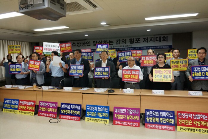 소상공인연합회, 직능경제인단체총연합회, 한국외식업중앙회 등 300여 단체로 구성된 한국자영업자총연대는 4일 서울 여의도 중소기업중앙회에서 '소상공인 말살하는 갑의 횡포 저지대회'를 개최했다.