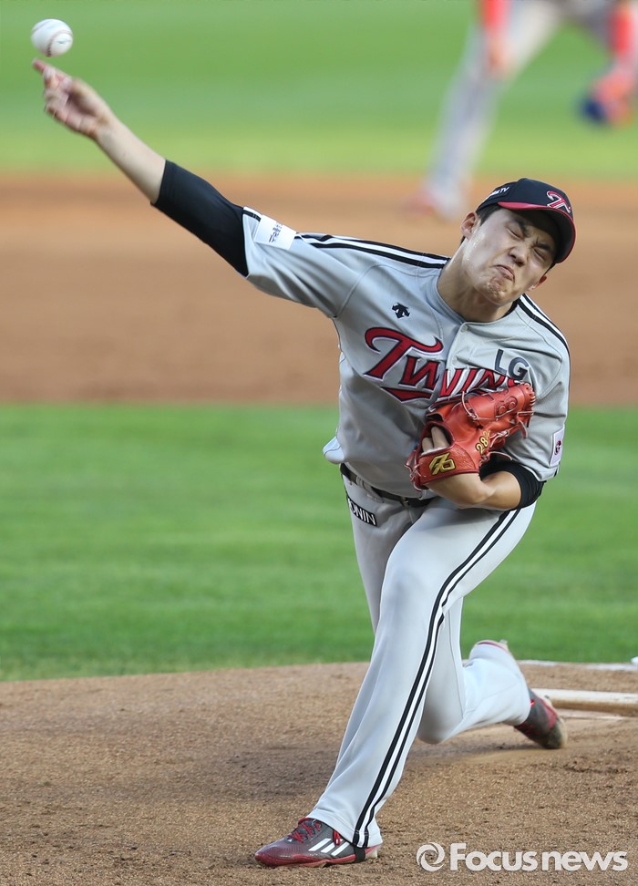 (서울=포커스뉴스) 4일 서울 잠실구장에서 열린 2016 프로야구 LG-두산 경기에서 1회말 LG 선발투수 임찬규가 투구하고 있다.