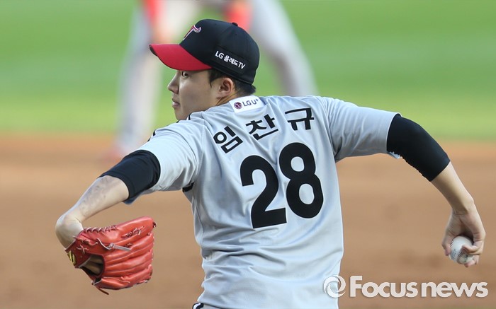 (서울=포커스뉴스) 4일 서울 잠실구장에서 열린 2016 프로야구 LG-두산 경기에서 1회말 LG 선발투수 임찬규가 투구하고 있다.
