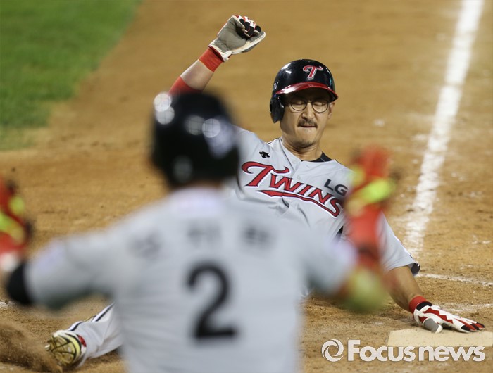 (서울=포커스뉴스) 4일 서울 잠실구장에서 열린 2016 프로야구 LG-두산 경기 연장 12회초 중전 안타로 진루한 LG 1루주자 박용택이 히메네스의 좌중간 2루타때 홈까지 뛰어 세이프되고 있다.
