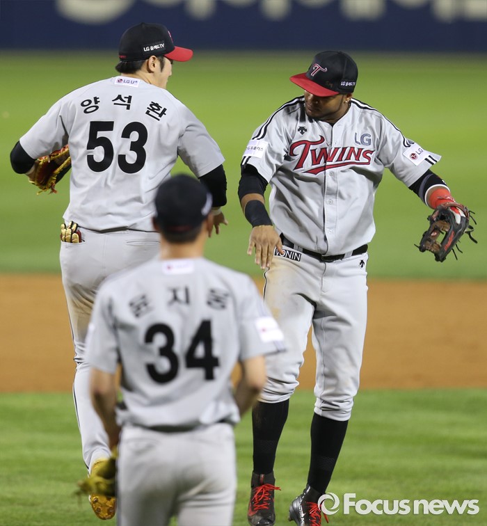 (서울=포커스뉴스) 4일 서울 잠실구장에서 열린 2016 프로야구 LG-두산 경기에서 두산을 연장 12회에 물리친 LG 히메네스와 양석환이 점프해서 몸을 부딪히며 기뻐하고 있다.