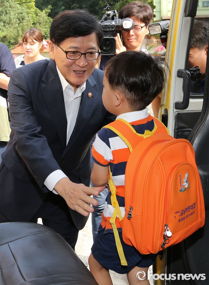 (세종=포커스뉴스) 정진엽 보건복지부 장관이 5일 오전 세종시 금남면 금남어린이집을 방문, 어린이통학차량으로 등원하는 어린이를 차량에서 내려주고 있다.