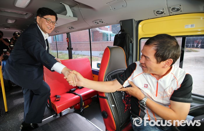 (세종=포커스뉴스) 정진엽 보건복지부 장관이 5일 오전 세종시 금남면 금남어린이집을 방문, 어린이통학차량 안전 점검 중 운전기사와 악수를 하고 있다.