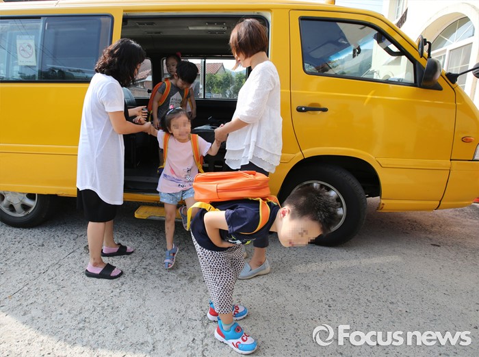 (세종=포커스뉴스) 5일 오전 세종시 금남면 금남어린이집에서 원생들이 통학차량을 이용해 등원하고 있다. 이날 정진엽 보건복지부장관은 유치원 통학차량 안전 점검을 실시했다.