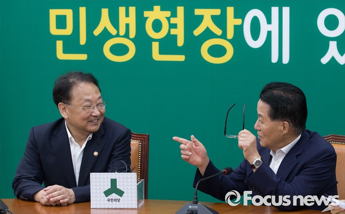 (서울=포커스뉴스) 5일 오전 서울 여의도 국회에서 추경 예산 등 협조를 위해 방문한 유일호(왼쪽) 경제부총리 겸 기획재정부 장관과 박지원 국민의당 비상대책위원장이 면담을 하고 있다.
