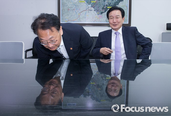 (서울=포커스뉴스) 5일 오전 서울 여의도 국회 의원회관에서 추경 예산 등 협조를 위해 방문한 유일호(왼쪽) 경제부총리 겸 기획재정부 장관이 변재일 더불어민주당 정책위의장과 만나 인사한 뒤 자리에 앉고 있다.