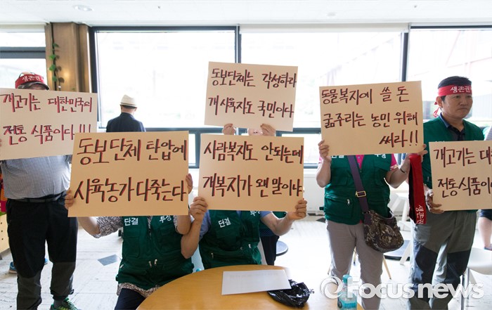 (서울=포커스뉴스) 5일 오전 서울 종로구 서울역사박물관에서 대한육견협회 회원들이 개 식용 종식을 위한 국제컨퍼런스를 반대하는 집회를 하고 있다.