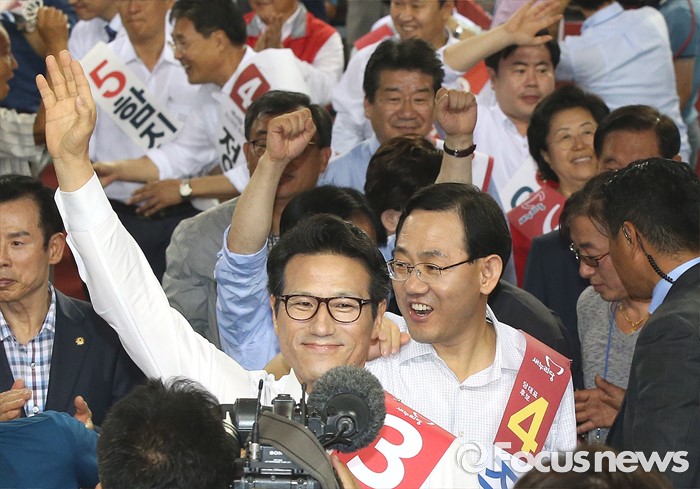 (천안=포커스뉴스) 5일 오후 충남 천안시 유관순체육관에서 열린 새누리당 대표 및 최고위원 선출 충청권 합동연설회에서 당대표에 출마한 정병국, 주호영 후보가 입장하고 있다.