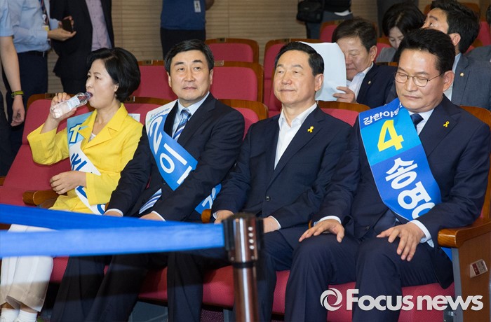 (서울=포커스뉴스) 5일 오후 서울 여의도 국회 의원회관에서 열린 더불어민주당 당대표 선출을 위한 예비경선대회에 참석한 추미애(왼쪽부터), 이종걸, 김상곤, 송영길 당대표 후보가 정견발표를 기다리고 있다.
