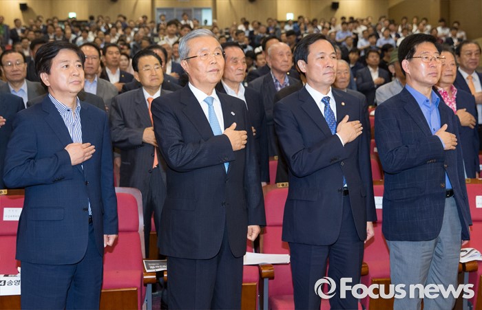 (서울=포커스뉴스) 5일 오후 서울 여의도 국회 의원회관에서 열린 더불어민주당 당대표 선출을 위한 예비경선대회에 참석한 노웅래(앞줄 왼쪽부터) 선거관리위원장, 김종인 비대위 대표, 우상호 원내대표, 양승조 비대위원 등이 국기에 대한 경례를 하고 있다.