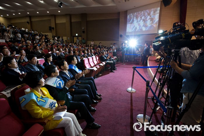 (서울=포커스뉴스) 더불어민주당 전당대회 당대표에 출마한 후보들이 5일 오후 서울 여의도 국회의원회관에서 열린 '전당대회 당대표 예비경선(컷오프)'에 참석해 정견발표를 기다리고 있다. 왼쪽부터 추미애 후보, 이종걸 후보, 김상곤 후보, 송영길 후보.
