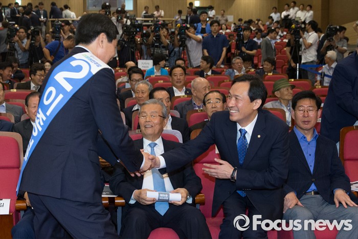(서울=포커스뉴스) 5일 오후 서울 여의도 국회 의원회관에서 열린 더불어민주당 당대표 선출을 위한 예비경선대회에 참석한 우상호 원내대표와 이종걸 당대표 후보가 인사하고 있다. 왼쪽부터 이 후보, 김종인 비대위 대표, 우 원내대표, 양승조 비대위원.