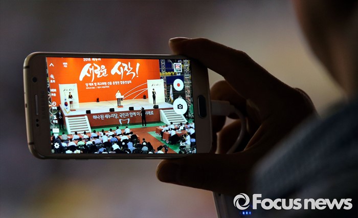 (천안=포커스뉴스) 5일 오후 충남 천안시 유관순체육관에서 열린 새누리당 대표 및 최고위원 선출 충청권 합동연설회에서 당원이 핸드폰으로 촬영을 하고 있다.