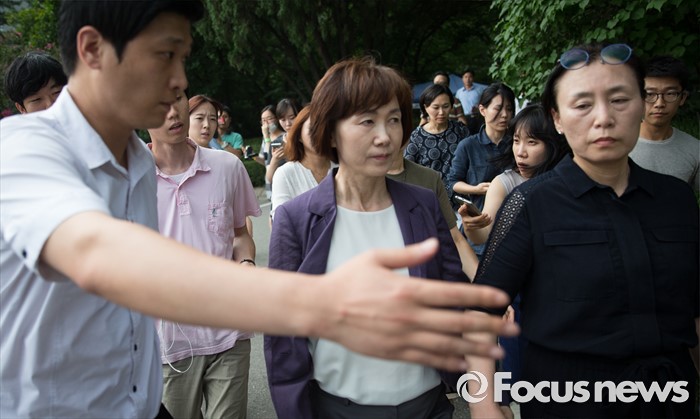 (서울=포커스뉴스) 최경희(앞줄 가운데) 이화여대 총장이 5일 오후 서울 서대문구 이화여대 본관을 점거농성 중인 학생들과 대화를 위해 방문했으나 만나지 못하고 돌아가고 있다. 이날 최경희 이화여대 총장은 대학 본관 점거농성 중 교수·교직원 감금 혐의를 받고 있는 학생들의 처벌을 원치 않는다며 탄원서를 경찰에 제출했고, 농성 중인 이화여대 학생들은 “이중적 행동”이라며 최 총장의 사퇴를 거듭 촉구했다.