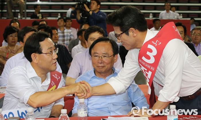 (천안=포커스뉴스) 5일 오후 충남 천안시 유관순체육관에서 열린 새누리당 대표 및 최고위원 선출 충청권 합동연설회에서 주호영 후보와 정병국 후보가 악수하고 있다.