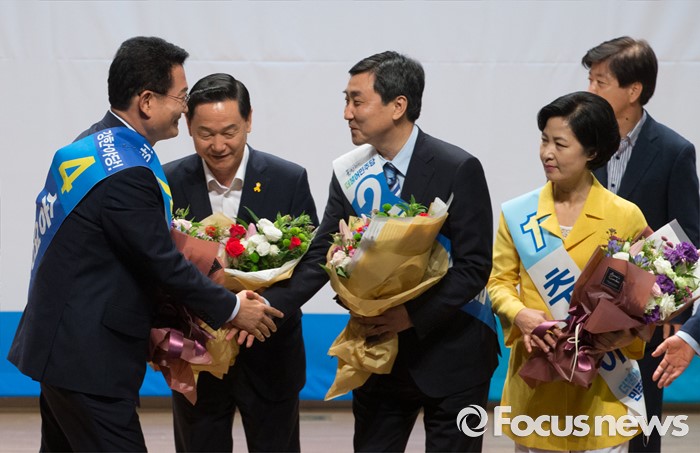(서울=포커스뉴스) 5일 오후 서울 여의도 국회 의원회관에서 열린 더불어민주당 당대표 선출을 위한 예비경선대회에 참석한 송영길 당대표 후보가 경선 탈락 후 경선 통과한 동료 후보들을 축하해주고 있다. 왼쪽부터 송 후보, 김상곤, 이종걸, 추미애 당대표 후보.