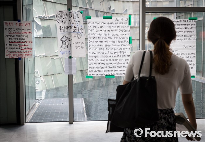 (서울=포커스뉴스) 5일 오후 서울 서대문구 이화여대 교내에 최경희 이화여대 총장의 미래라이프 단과대학 설립 추진을 규탄하는 대자보가 부착돼 있다. 이날 최경희 이화여대 총장은 대학 본관 점거농성 중 교수·교직원 감금 혐의를 받고 있는 학생들의 처벌을 원치 않는다며 탄원서를 경찰에 제출했고 농성 중인 이화여대 학생들은 “이중적 행동”이라며 최 총장의 사퇴를 거듭 촉구했다.