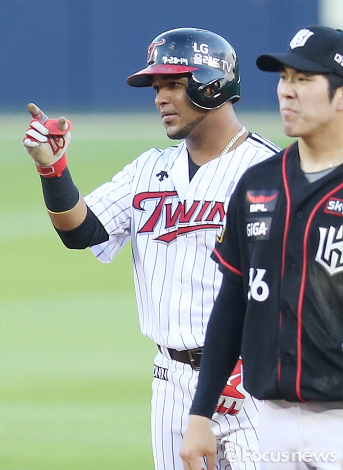 (서울=포커스뉴스) 5일 서울 잠실구장에서 열린 2016 프로야구 kt-LG 경기 1회말 무사 1,3루에서 LG 히메네스가 2타점 우중간 2루타를 치고 2루에서 주루코치를 향해 손짓을 하고 있다.