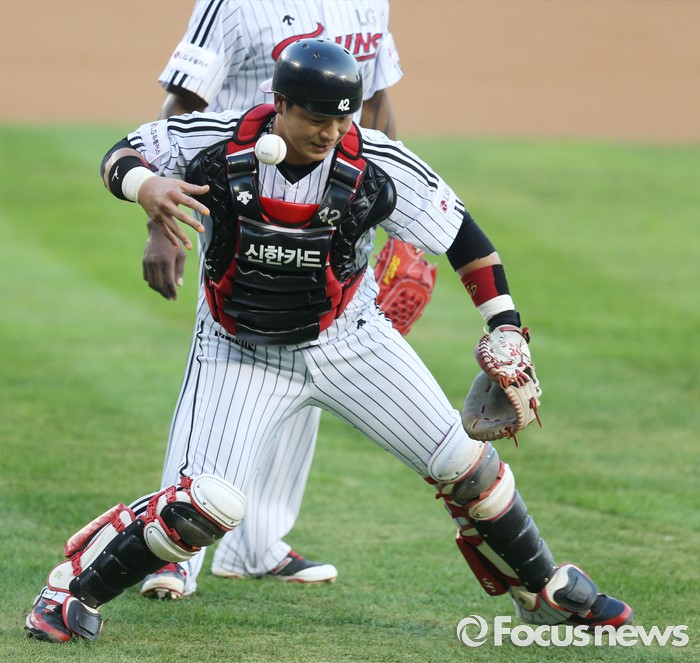 (서울=포커스뉴스) 5일 서울 잠실구장에서 열린 2016 프로야구 kt-LG 경기에서 1회초 1사후 LG 포수 정상호가 kt 전민수의 기습 번트 타구를 잡다 저글링하고 있다.