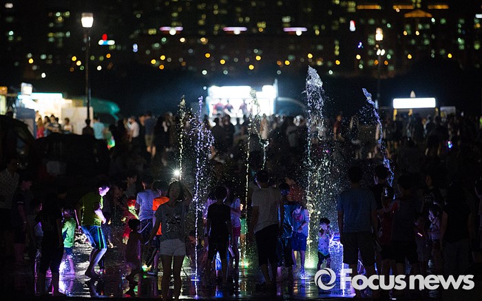 (서울=포커스뉴스) 폭염과 열대야가 지속되고 있는 5일 오후 서울 여의도 한강공원 내 물빛광장을 찾은 시민들이 물놀이를 하며 더위를 식히고 있다.