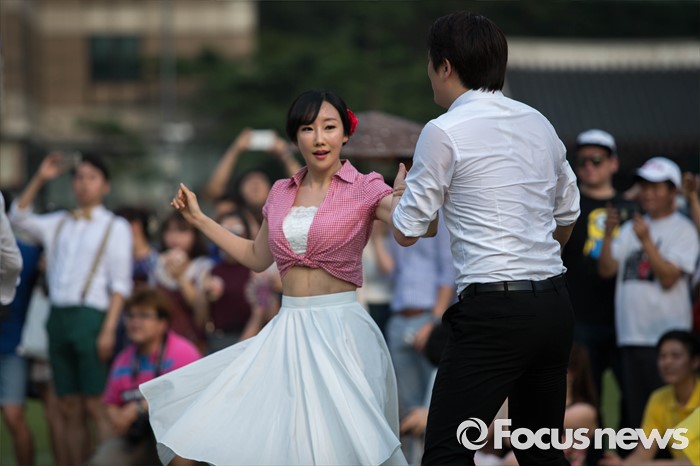 (서울=포커스뉴스) 6일 오후 서울 중구 시청 앞 광장에서 열린 '서울 스윙댄스 페스티벌'에서 청년문화예술단체 딴따라땐스홀 회원들이 음악에 맞춰 스윙댄스를 추고 있다.
