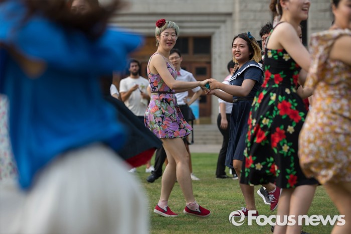 (서울=포커스뉴스) 6일 오후 서울 중구 시청 앞 광장에서 열린 '서울 스윙댄스 페스티벌'에서 청년문화예술단체 딴따라땐스홀 회원들이 음악에 맞춰 스윙댄스를 추고 있다.