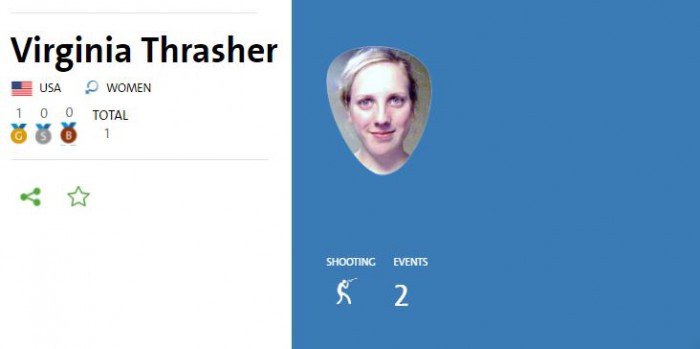 (서울=포커스뉴스) 2016 리우올림픽 첫 금메달이 미국 여자 10m 공기소총에서 나왔다. 리우올림픽 첫 금메달은 미국 사격 대표 버지니아 트래셔가 차지했다.