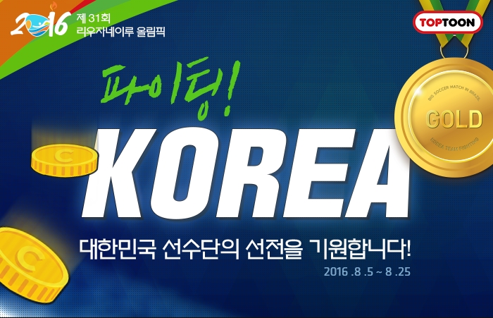 (서울=포커스뉴스) 탑코믹스에서 운영하고 있는 웹툰 전문 플랫폼 '탑툰'이 2016 리우올림픽에 출전한 한국 대표팀을 응원하기 위해 '파이팅 KOREA'이벤트를 실시한다.