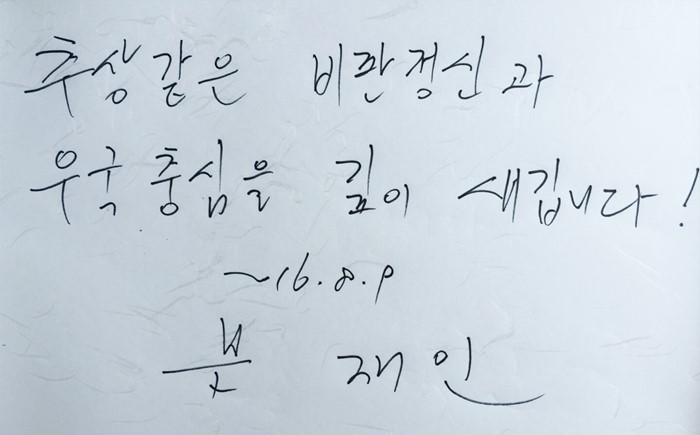 (서울=포커스뉴스) 문재인 더불어민주당 전 대표가 7일 오전 전남 광양 봉강면 매천 황현 선생 생가를 방문해 방명록을 남겼다. 사진은 문 전 대표가 남긴 방명록. <사진제공=문재인 전 대표측>