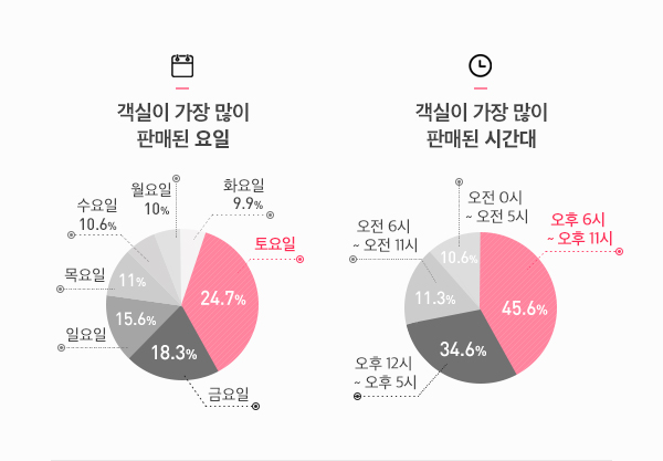 객실 판매량이 많은 시간대는 오후 6시에서 11시로 전체의 45.6%인 것으로 조사됐다. '숙박'은 밤 9시(10%), '대실'은 오후 3시(10.8%) 결제가 가장 많았다.