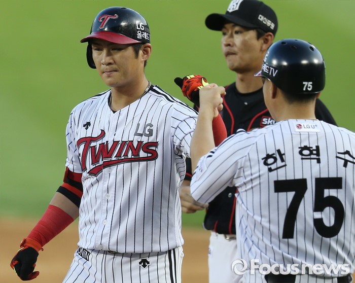 (서울=포커스뉴스) 5일 서울 잠실구장에서 열린 2016 프로야구 kt-LG 경기 3회말 2사 만루에서 LG 오지환이 2타점 우전 안타를 치고 1루에서 한혁수 코치의 축하를 받고 있다.