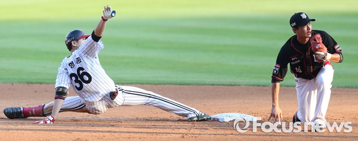 (서울=포커스뉴스) 5일 서울 잠실구장에서 열린 2016 프로야구 kt-LG 경기 2회말 2사후 LG 이형종이 좌익수 왼쪽 펜스를 맞히는 안타를 치고 2루에서 슬라이딩후 심판에게 타임을 요청하고 있다. 세이프된 이형종은 합의판정에서 아웃으로 번복되었다.오른쪽은 kt 2루수 박기혁.