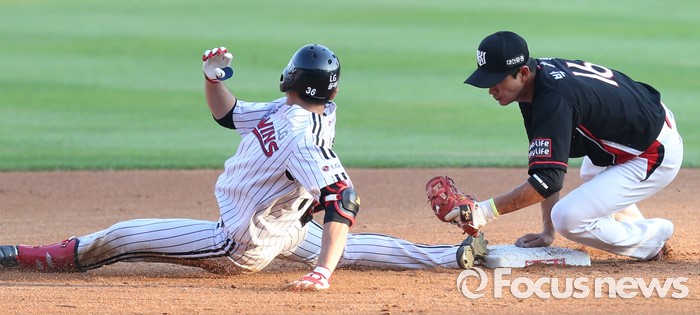 (서울=포커스뉴스) 5일 서울 잠실구장에서 열린 2016 프로야구 kt-LG 경기 2회말 2사후 LG 이형종이 좌익수 왼쪽 펜스를 맞히는 안타를 치고 2루에서 kt 2루수 박기혁의 태그를 피하며 슬라이딩하고 있다. 세이프된 이형종은 합의판정에서 아웃으로 번복되었다.