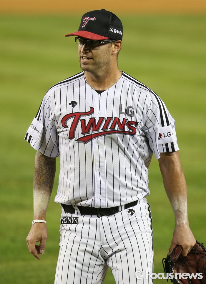 (서울=포커스뉴스) 5일 서울 잠실구장에서 열린 2016 프로야구 kt-LG 경기에서 LG 선발투수 허프가 6회 수비를 마치고 더그아웃으로 들어가며 포수 유강남과 밝은 표정으로 대화하고 있다.