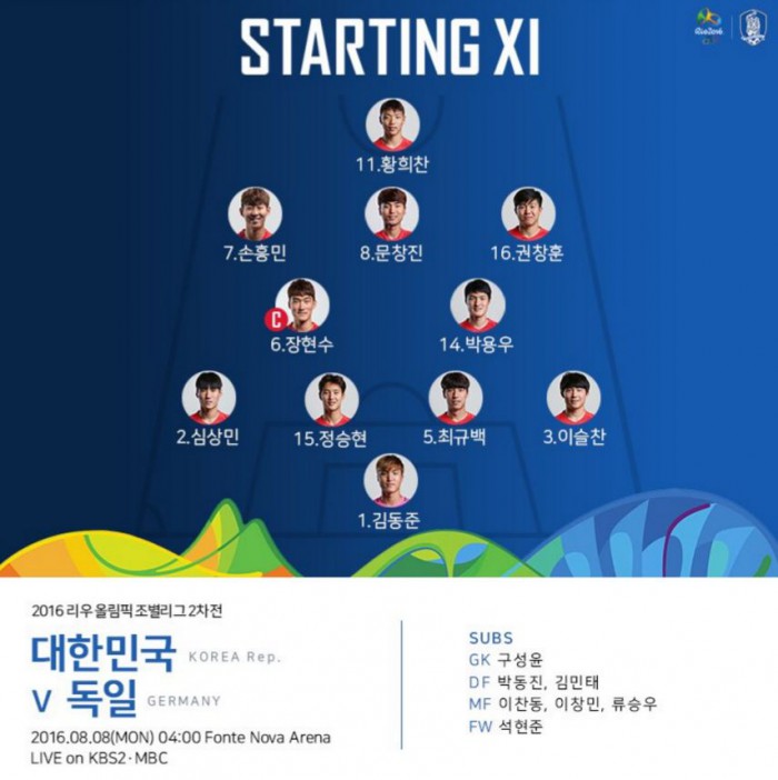 한국은 4-2-3-1 전술로 나선다. 원톱에는 황희한이 출격한다. 2선에서 손흥민과 문창진, 권창훈이 지원한다. 중원은 장현수와 박용우가 호흡을 맞춘다. 4백은 심상민, 정승현, 최규백, 이슬찬이 나서고 골문은 김동준이 지킨다.올림픽 축구대표팀 선발명단 <사진출처=대한축구협회 공식 트위터>