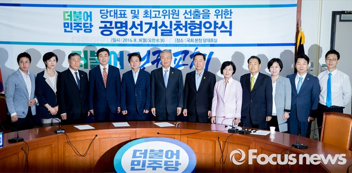 (서울=포커스뉴스) 8일 오전 서울 여의도 국회에서 열린 더불어민주당 당대표 및 부문별 최고위원 선출을 위한 공명선거 협약식에 참석한 당대표 및 최고위원 후보자들이 취재진을 향해 포즈를 취하고 있다. 왼쪽부터 이동학, 유은혜, 제정호 최고위원 후보, 이종걸 당대표 후보, 노웅래 선거관리위원장, 김종인 비대위 대표, 김상곤, 추미애 당대표 후보, 송현섭, 양향자, 김병관, 장경태 최고위원 후보.